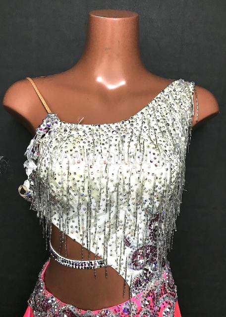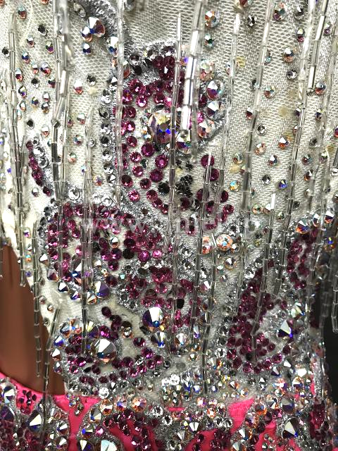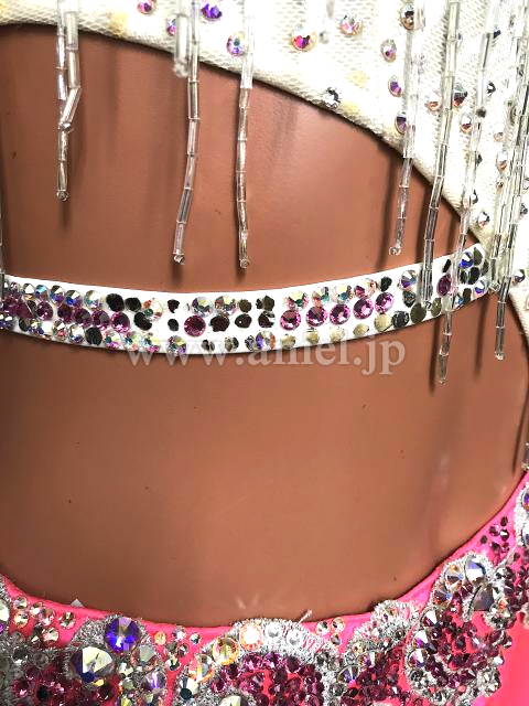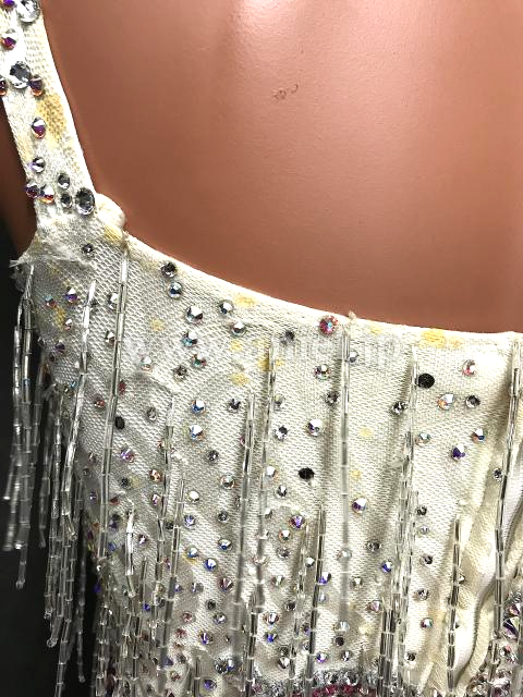 ボディはモチーフレースにビーズフリンジ、ストーンで装飾されています。