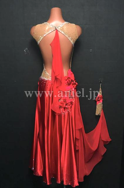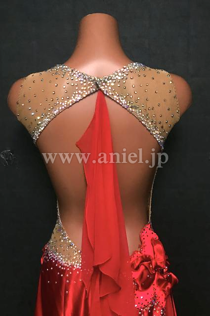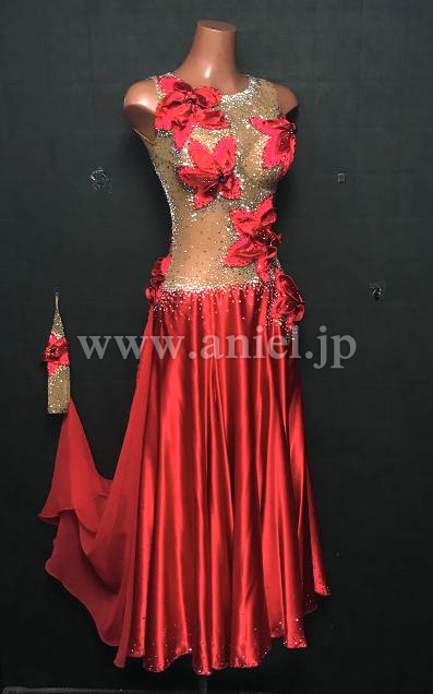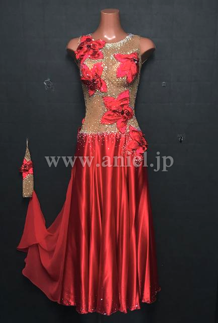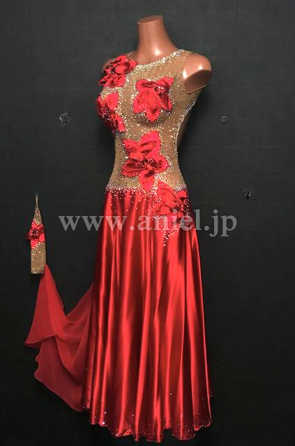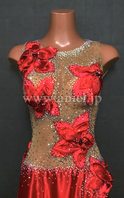 ベージュボディに赤のサテンスカートの光沢が美しいドレスです。