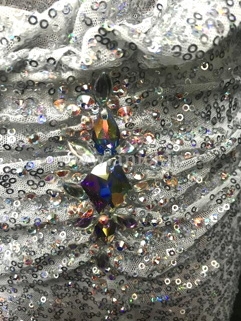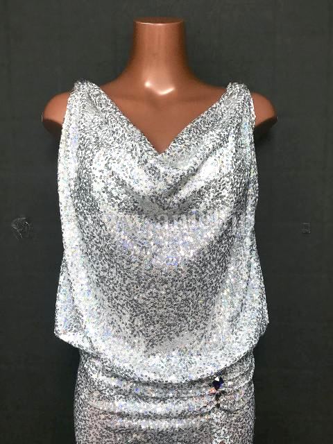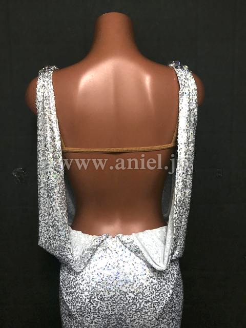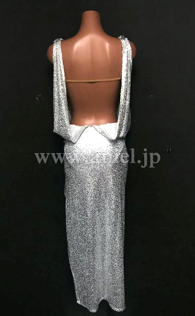 スパンコール生地のロングドレス。