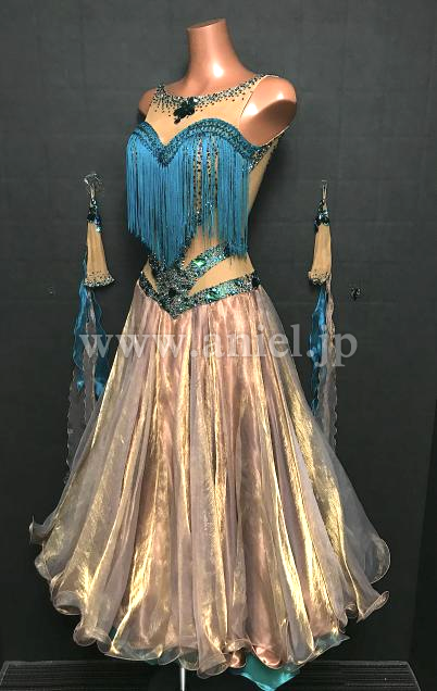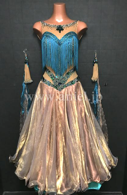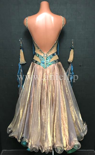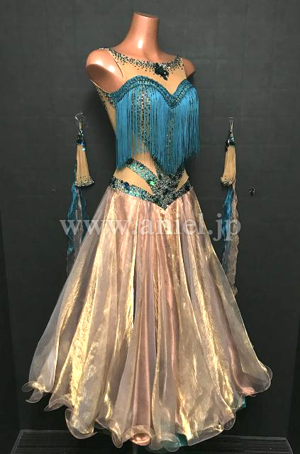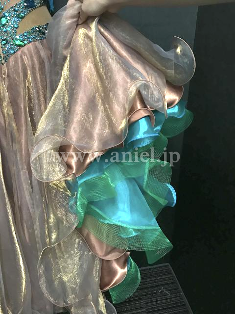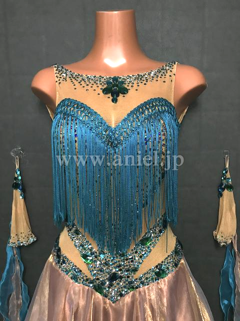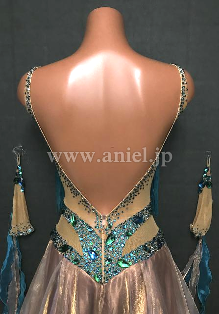 スキンカラーとジェードカラーのコントラストがおしゃれなドレスです。