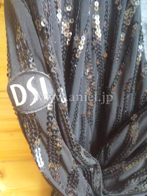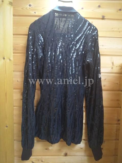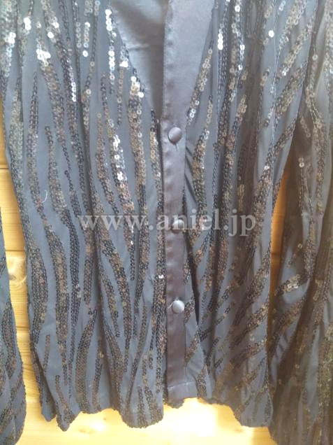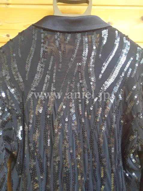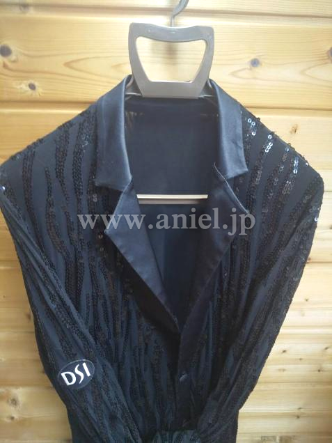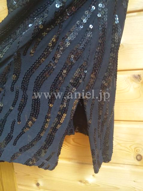 伸縮性のあるソフトな生地です。全体にスパンコールの装飾があり両サイドにスリットがあります。スリムに見えるデザインで動きやすくフロア映えします。袖口に経年劣化があります。