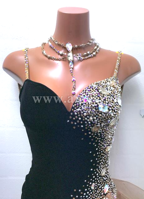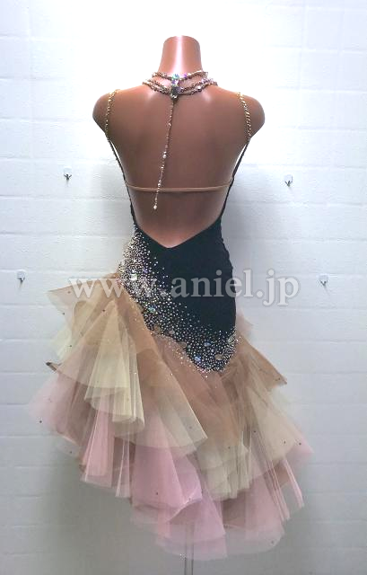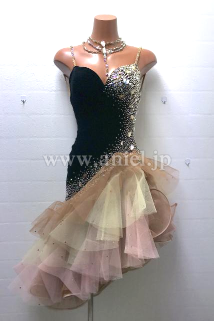 ベルベット黒のボディに淡いカラーのチュールスカートが上品なラテンドレス。