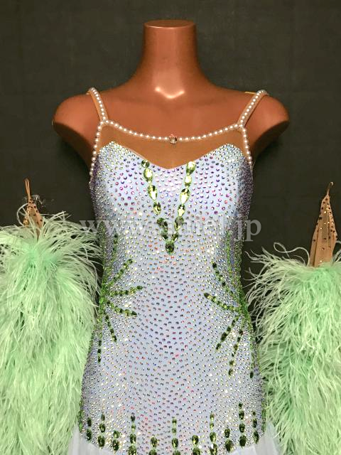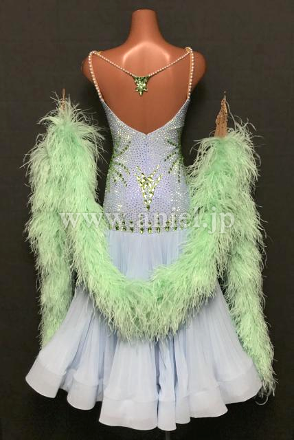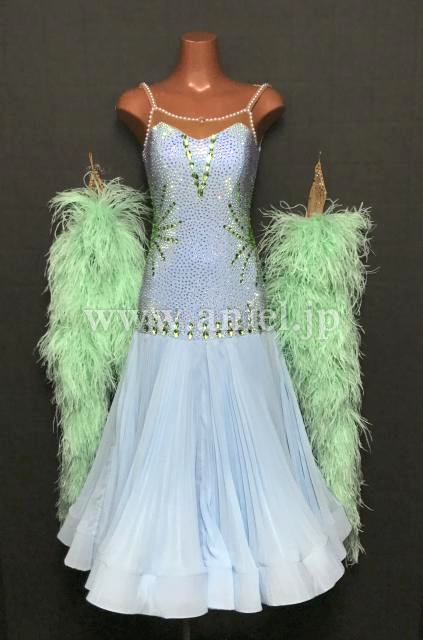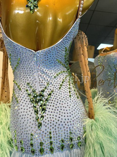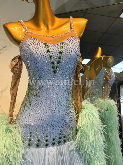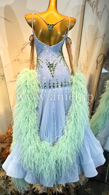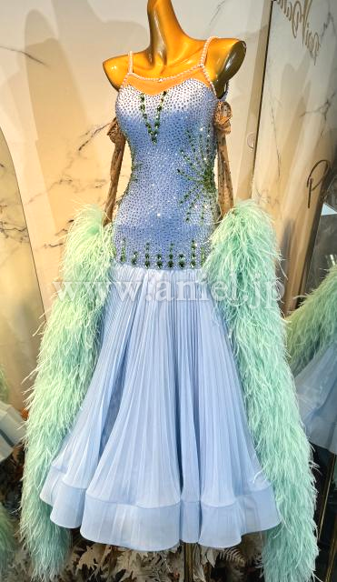 水色の美しいカラーにペパーミントの組み合わせが淡くエレガントなドレスです。