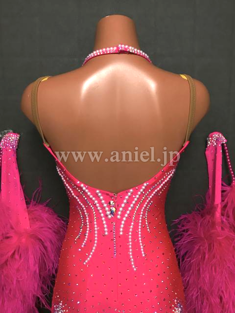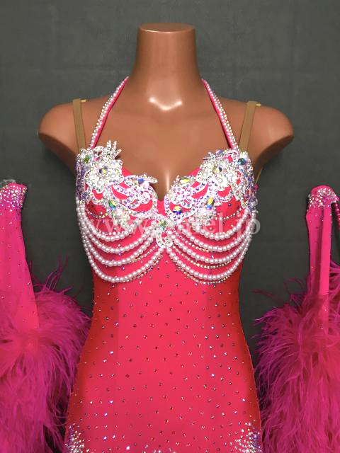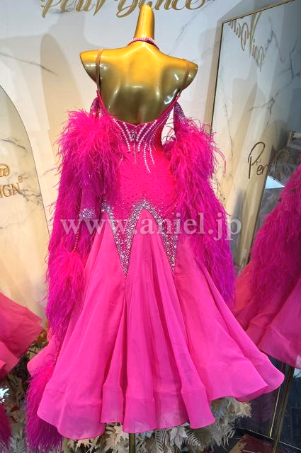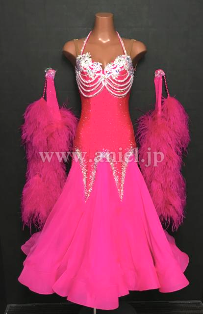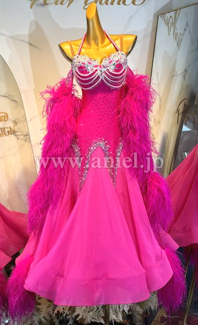 鮮やかなショッキングピンクにホワイトレース、パールが映えるドレスです。