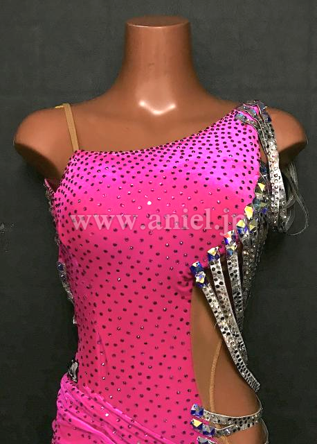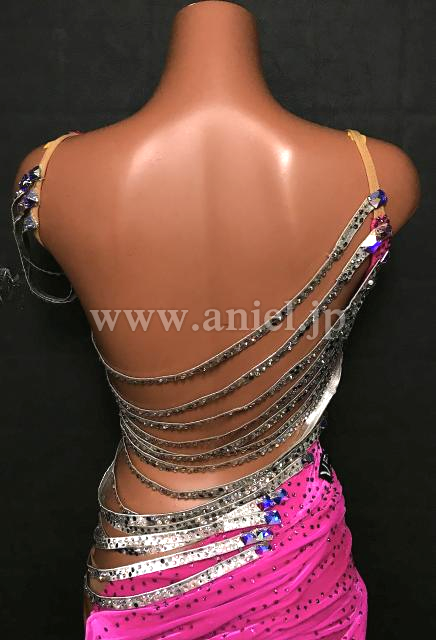 ベルベットのピンク生地にシルバーの紐装飾が揺れるドレスです。