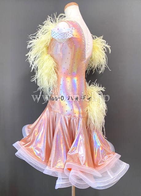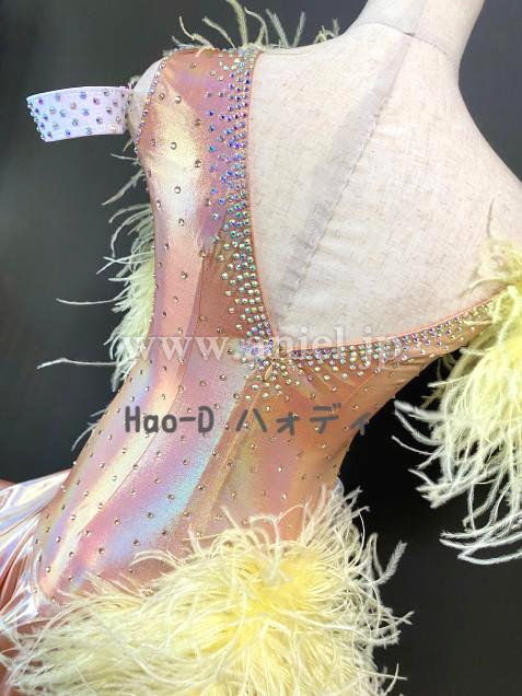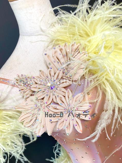 クリームイェローのオーストリッチは胸元とヒップのボリュームをアップし、可愛さプラス