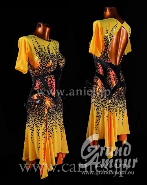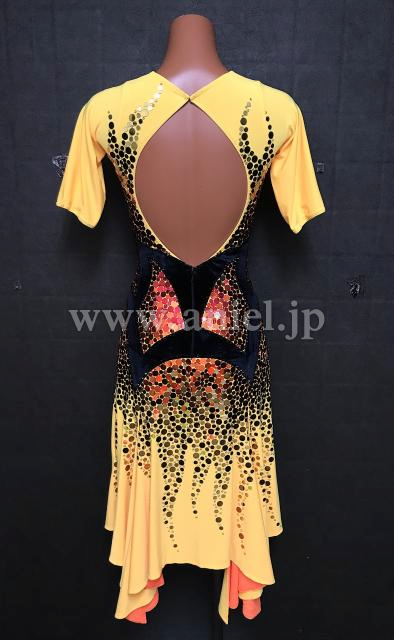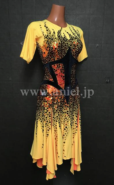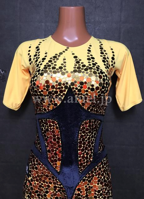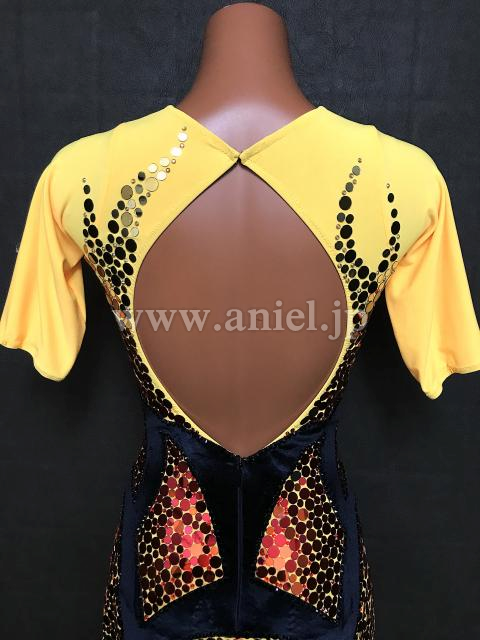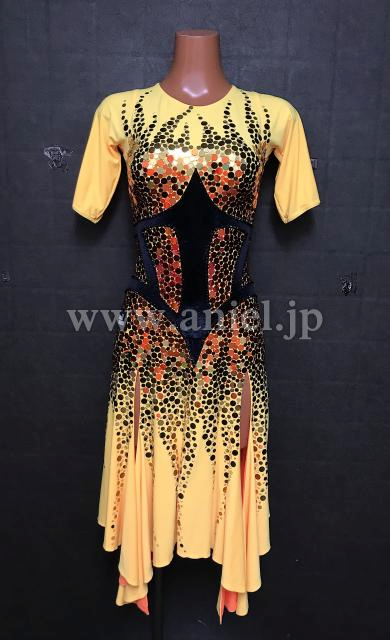 マット感のあるクレープ生地に、炎をイメージした面白いデコレーションが特長です。装飾はオールミラー。腰にユニークな形のコルセット型のウエストマークがあって、細身に見せてくれるデザインです。スカートはアシンメトリーのフレアタイプ。競技でもデモでも着ていただけます。