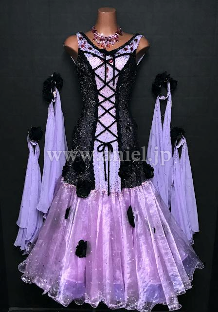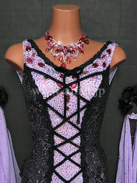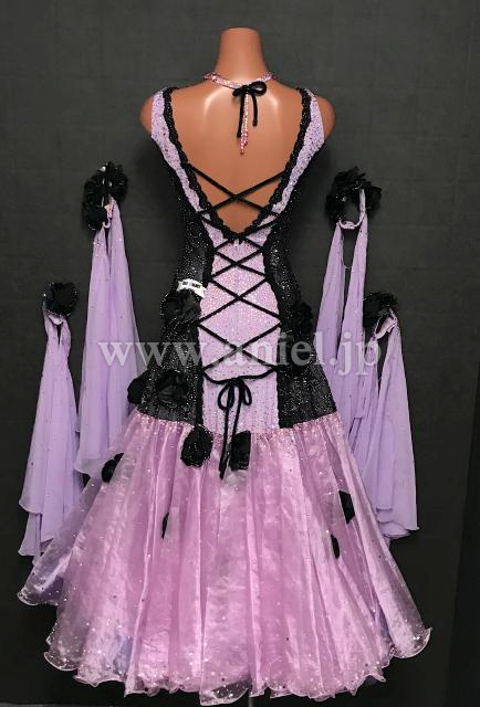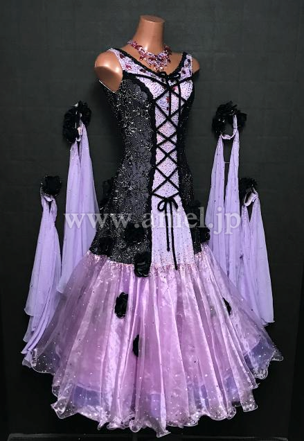 ラベンダーに黒レースが重ねられた可愛らしいドレスです。