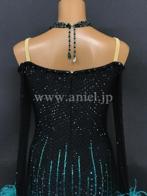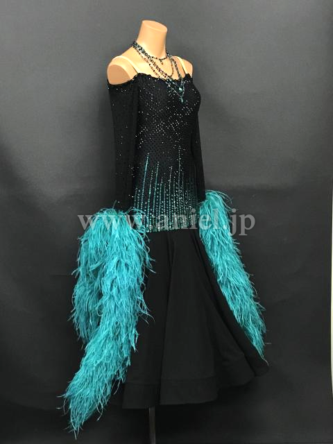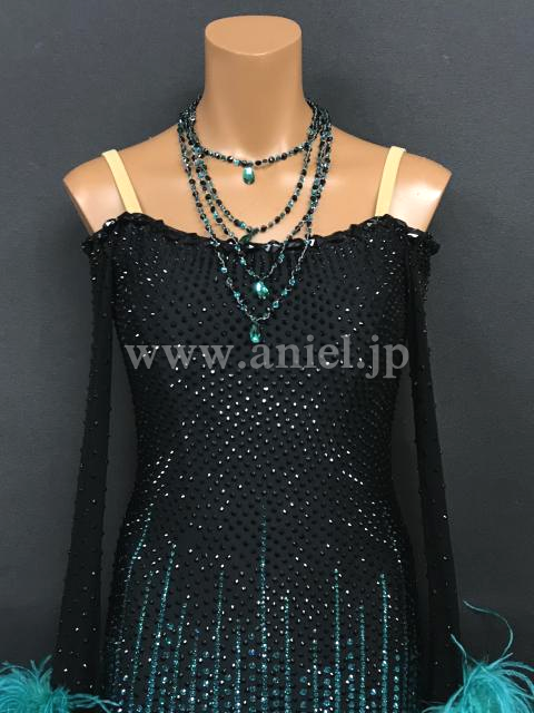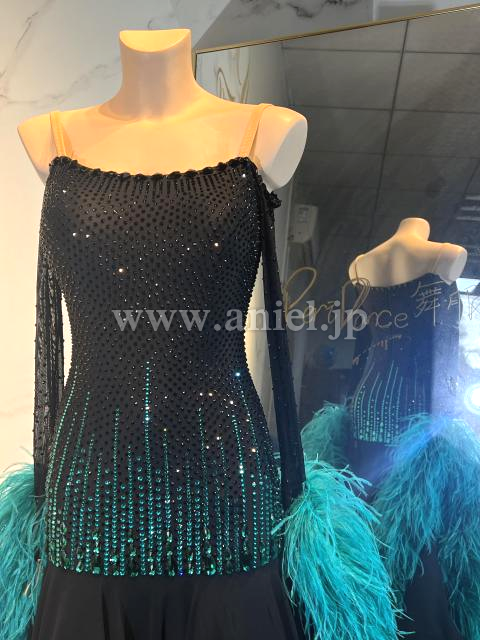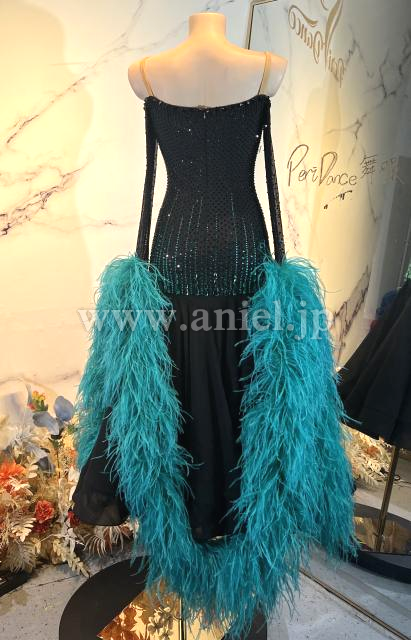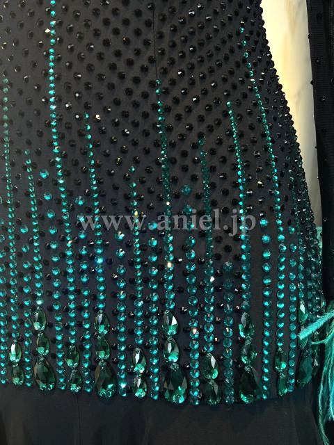 黒にジェードのストーンと羽根フロートが映えるドレスです。