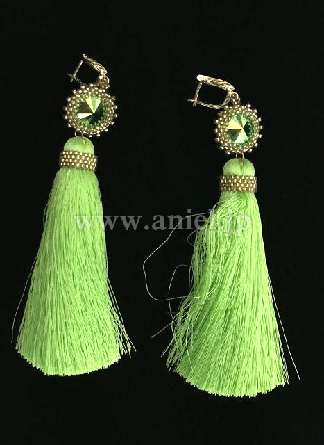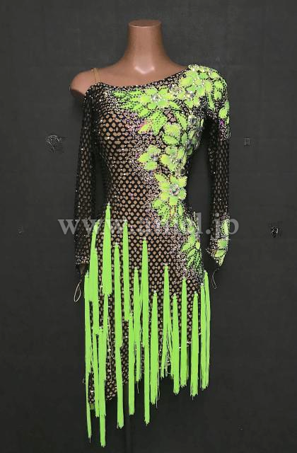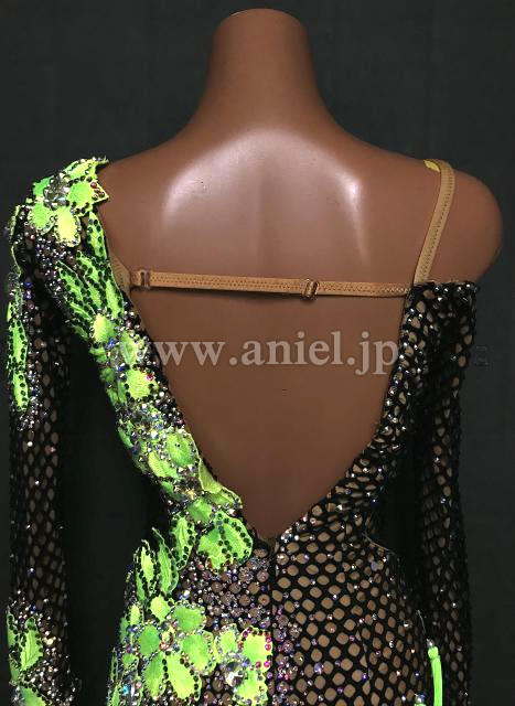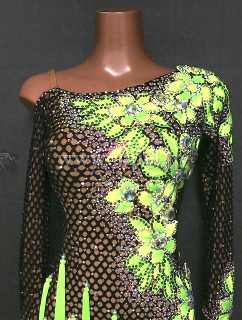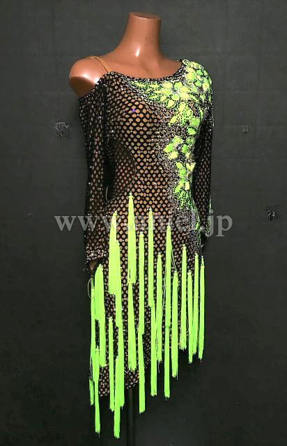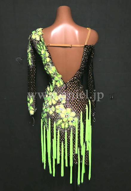 メッシュボディに鮮やかな蛍光緑のモチーフレース、フリンジがよく映えるドレスです。
