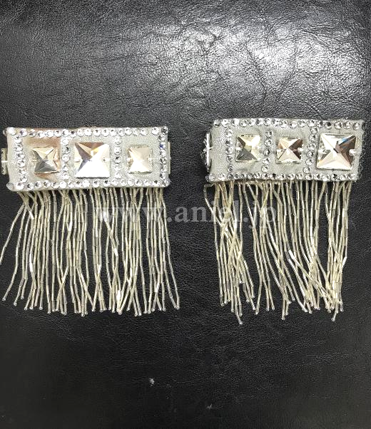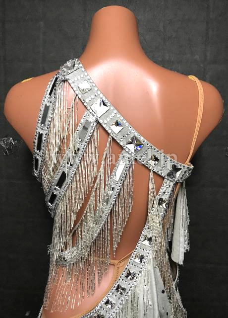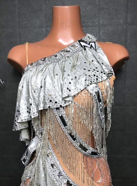 シルバーの垂れるデザイン、ビーズフリンジ、ミラーがキラキラと光ります。
