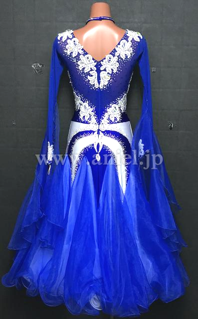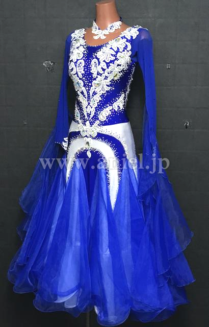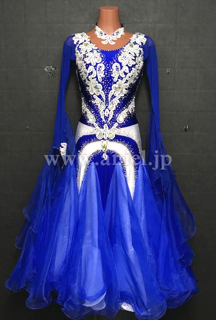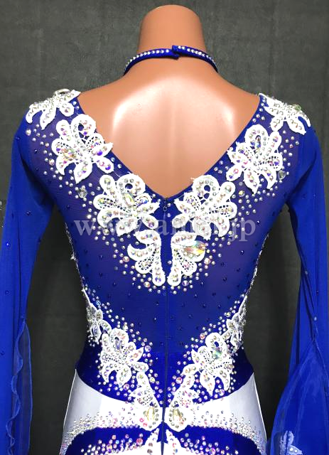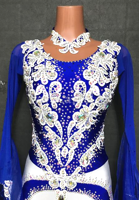 青に白のモチーフで装飾されているドレス