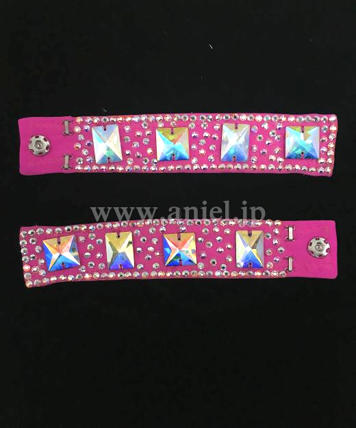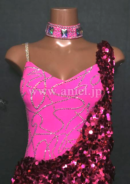 ピンクのレオタードに深いピンクスパンコール生地を