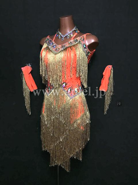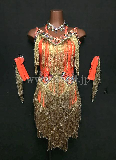 鮮やかなオレンジにゴールドのフリンジが目立つドレスです。