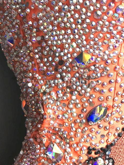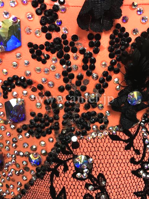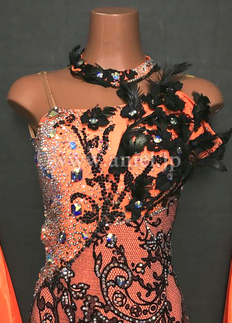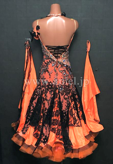 明るいオレンジに黒のレース生地が重ねられた可愛らしいドレス。