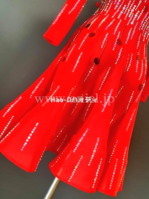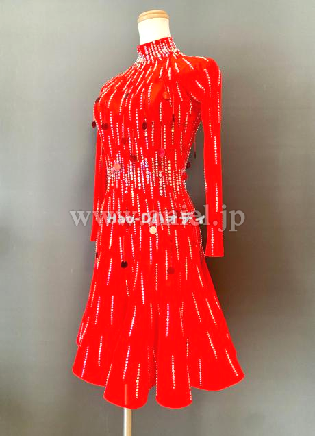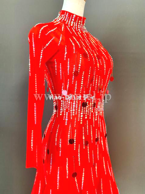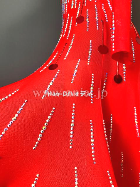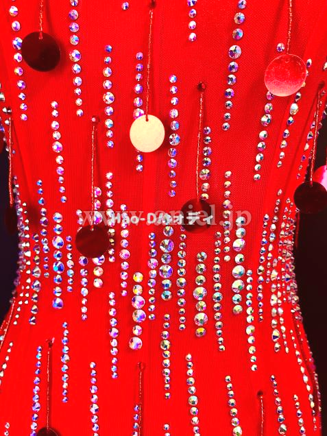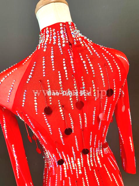 オーロラストーン&ビーズスパンコールをシャープな縦ラインに装飾した真っ赤なドレス