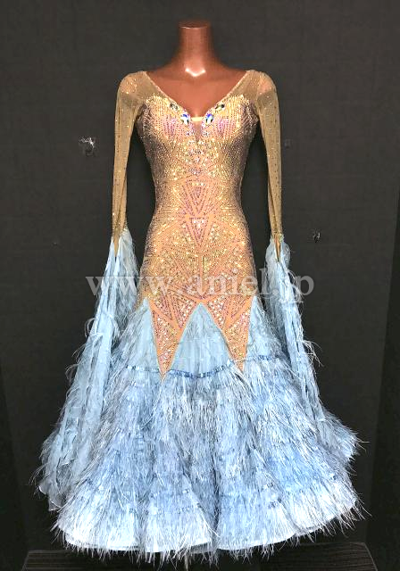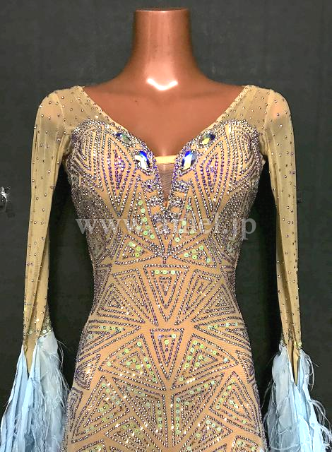 ベージュボディにストーンとスパンコールが美しく模様を描くドレス。
