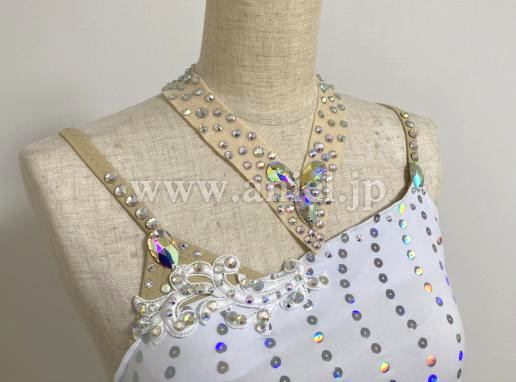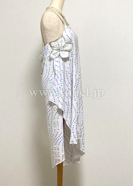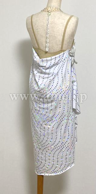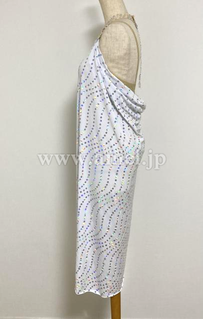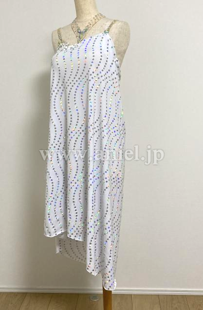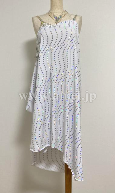 白色スパンコールのストレッチ生地で伸縮性があり、レオタード一体型で着脱しやすいドレスです。