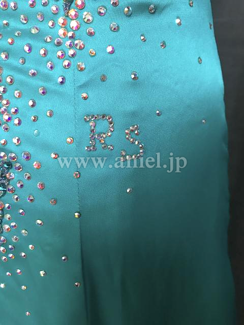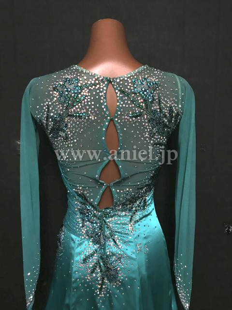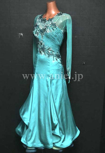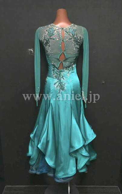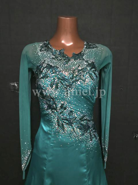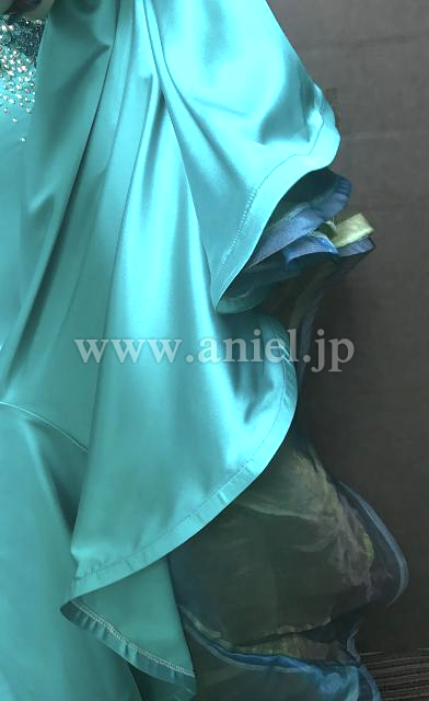 サテン生地のジェードカラーが美しいドレスです。