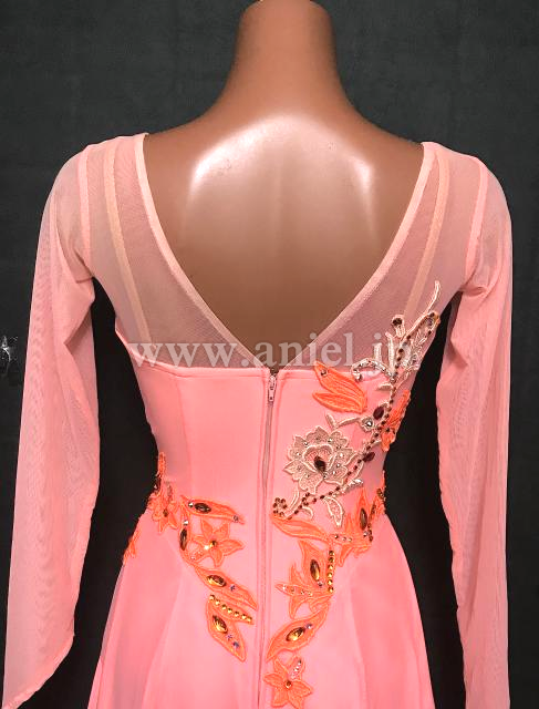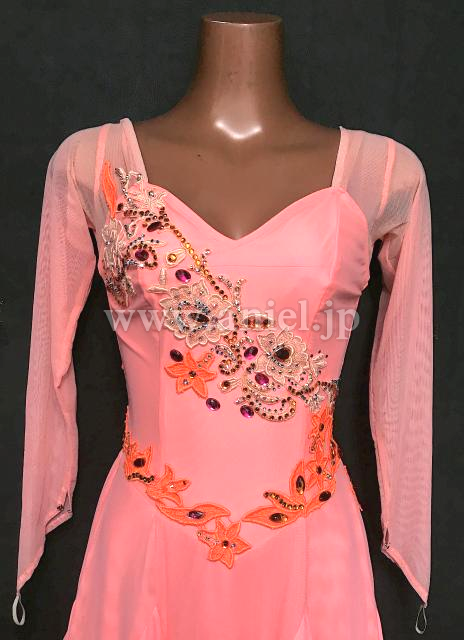 鮮やかなオレンジピンクのドレスです。