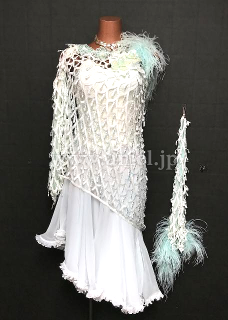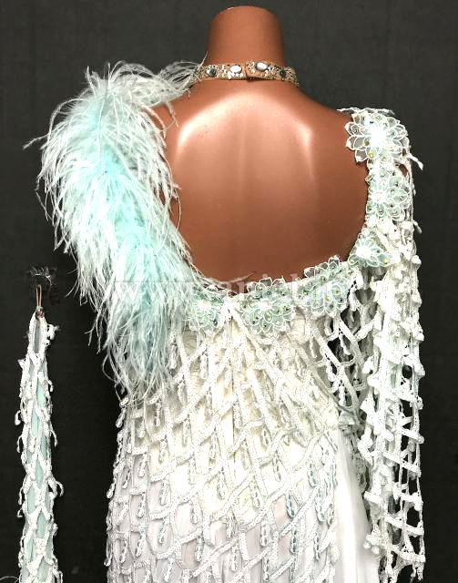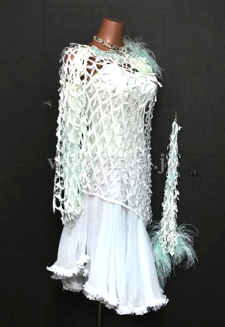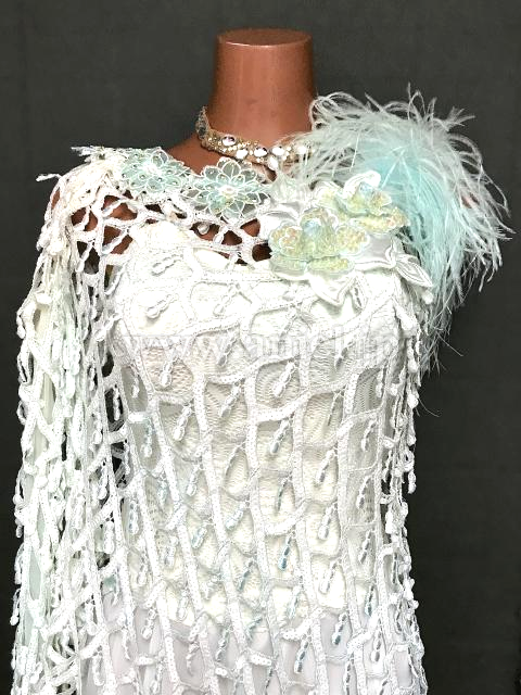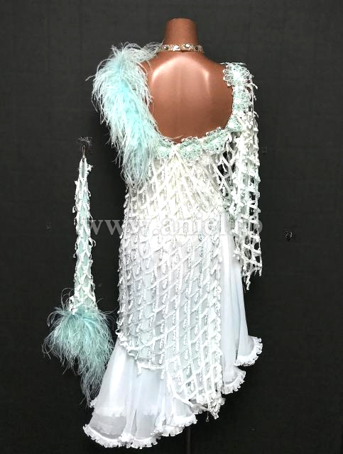 網目上の生地が上にかけられた凝ったデザインのドレスです。