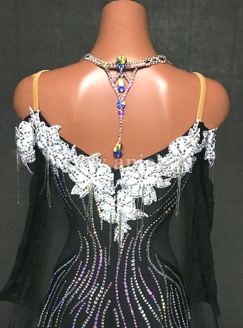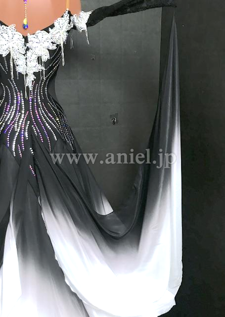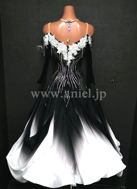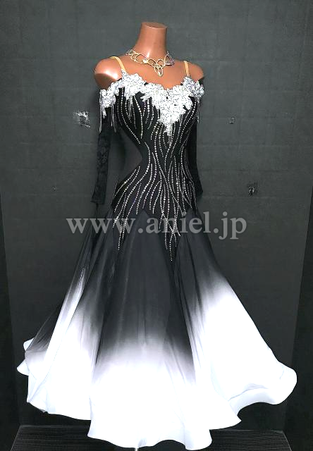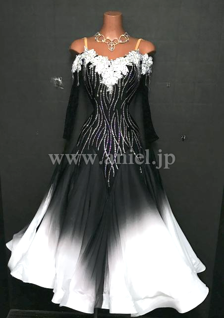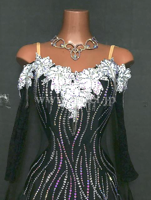 黒のボディに白のモチーフレースが立体に飾られたドレスです。