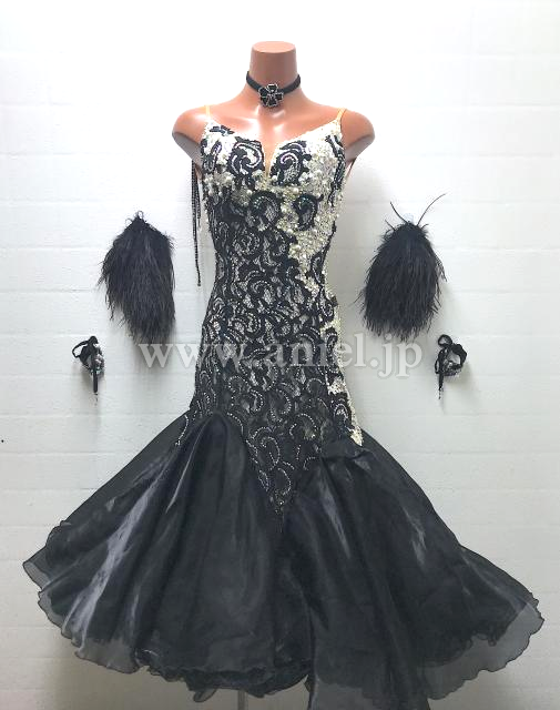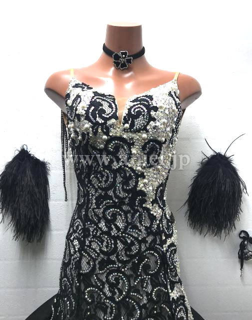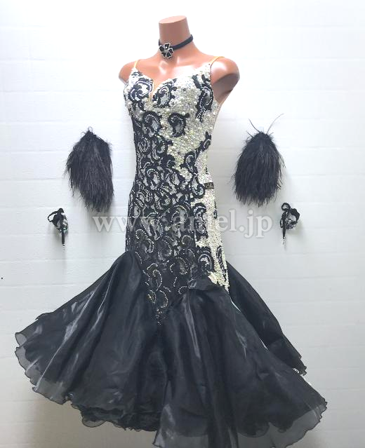 白をベースに、ブラックのモチーフを全体的に使用したドレス。