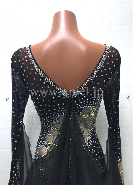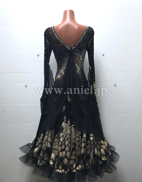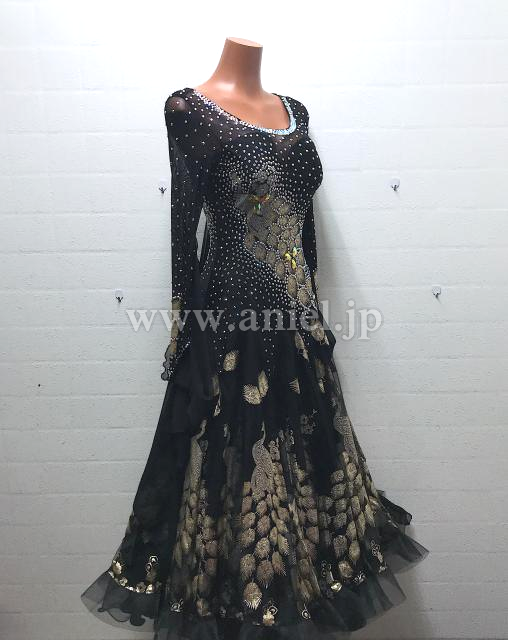 ゴールドの孔雀模様の生地のスカートが珍しいドレスです。