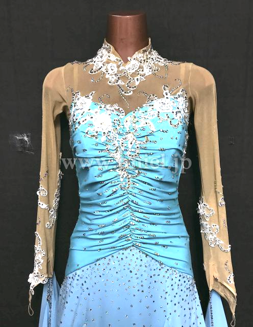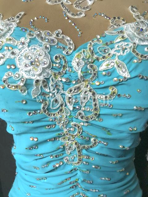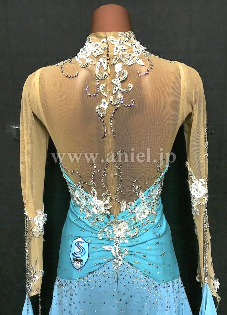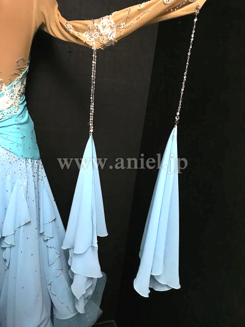 水色のボディに白モチーフが飾られています。
