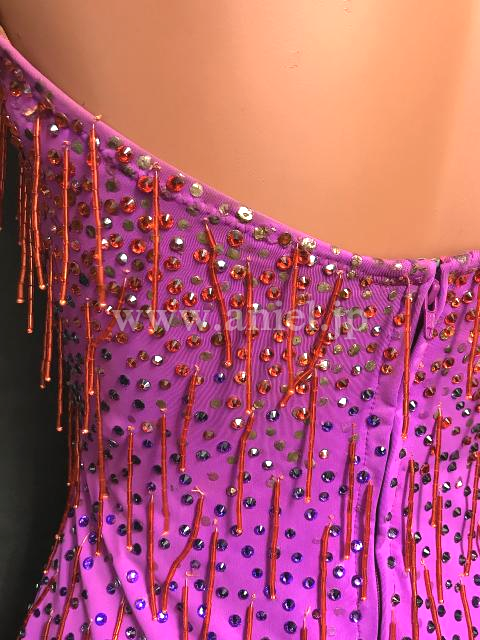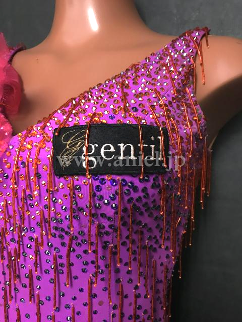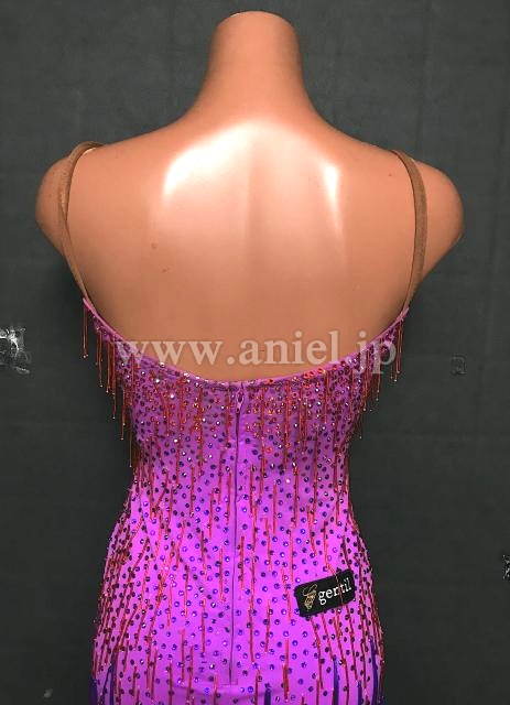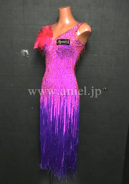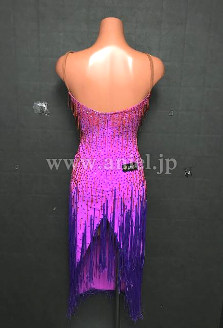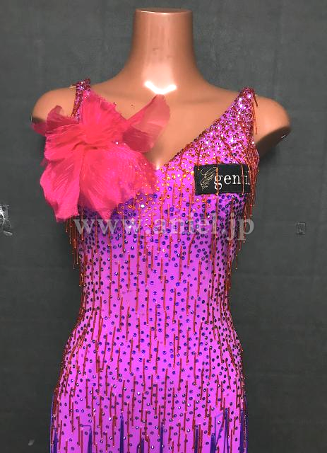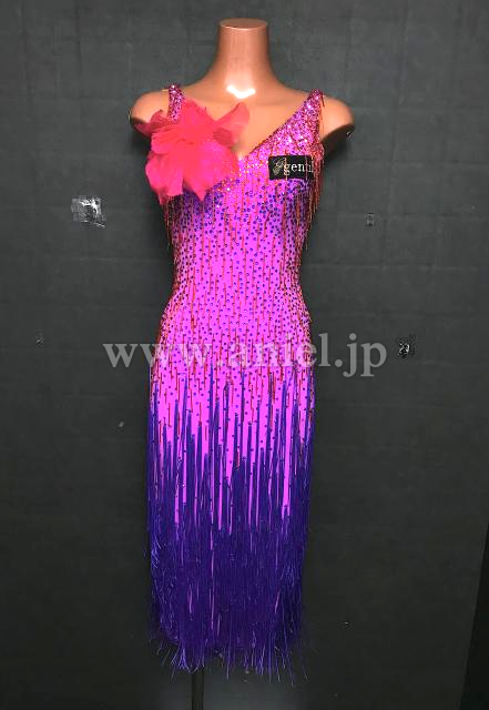 ピンクから紫のフリンジでグラデーションのようなカラー使いになっているドレス。