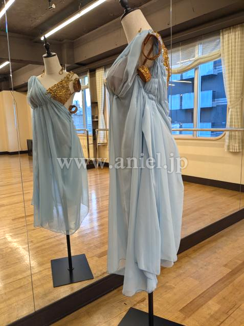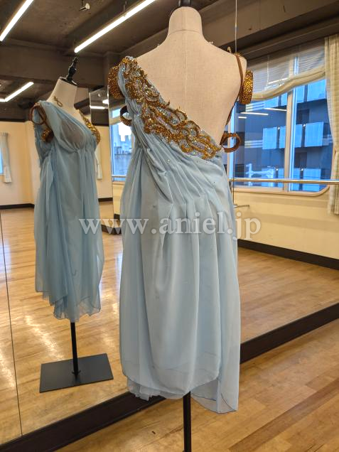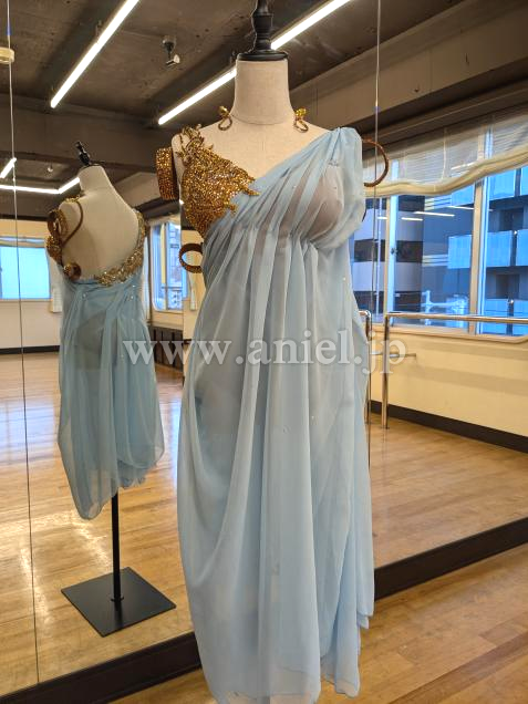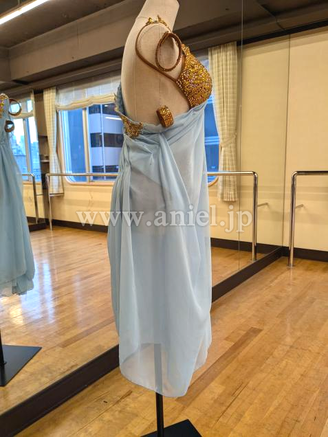 柔らかい水色のシフォン生地に、ゴールドのモチーフがアクセントのルンバドレスです。