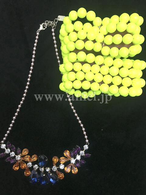 首元の黄色パールのネックレスが個性的です