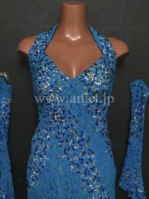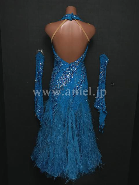とても鮮やかなターコイズブルーのドレスです。上半身にはスワロフスキーがびっしりと付いておりキラキラと輝きます。スカートの部分にはオーストリッチフリンジがたっぷりあしらわれ、踊るたびにふわふわと揺れてステキです。