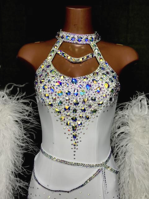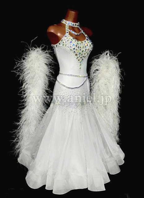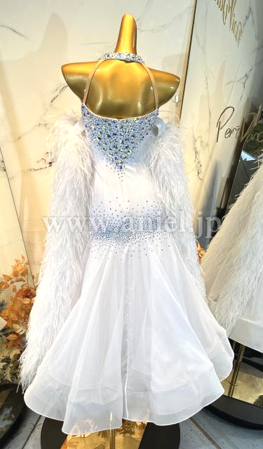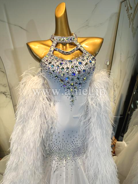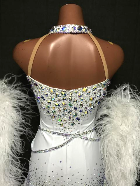 純白の美しいドレスです。胸元と背中は大粒のオーロラストーンが豪華に装飾されています。