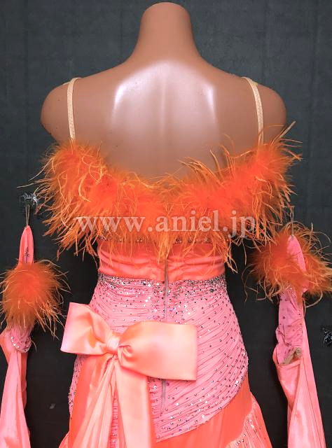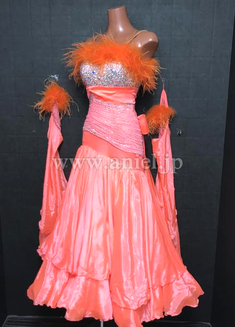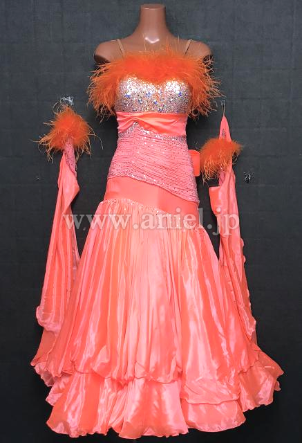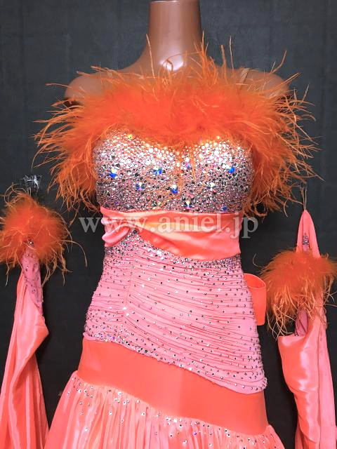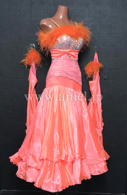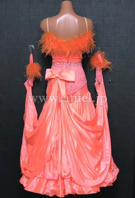 明るいサーモンオレンジカラーが華やかなドレス。