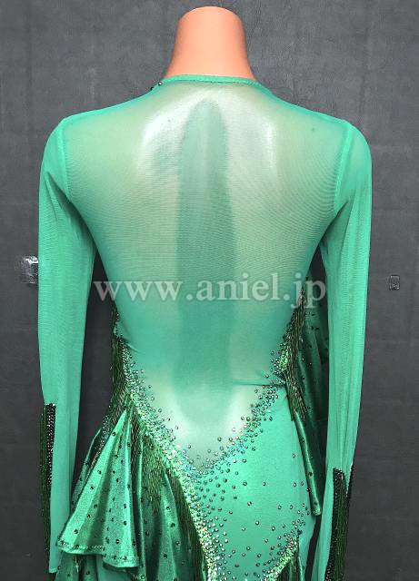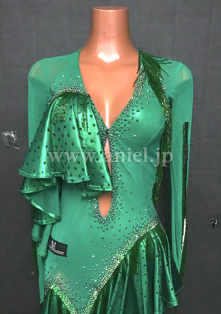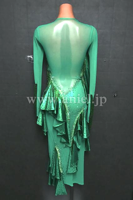 メタリックグリーンのフリルが目立ちます。