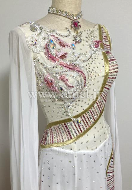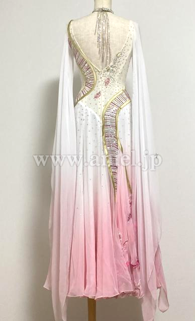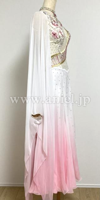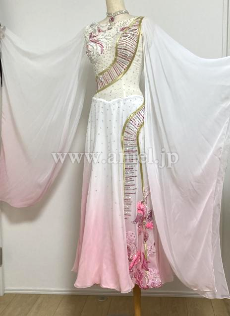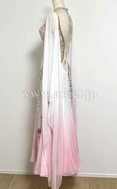 白〜ピンク色のグラデーションのフロートが腕から手首まで付いていて二の腕をカバーしながら揺れるデザインが素敵です、スカートにお花のデザインあり。