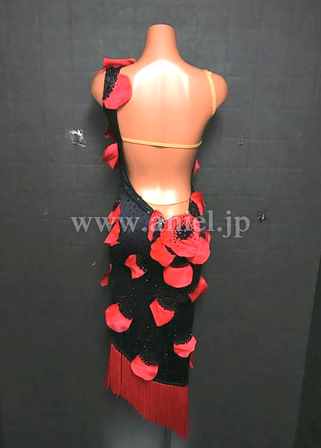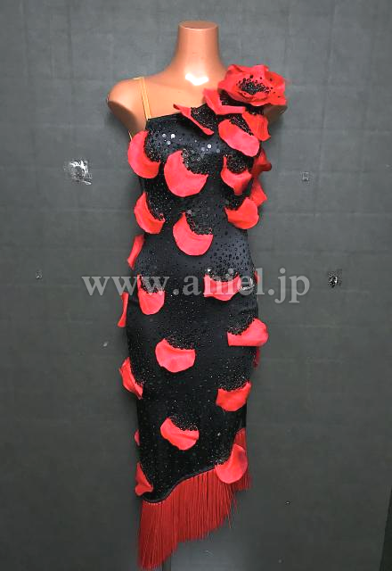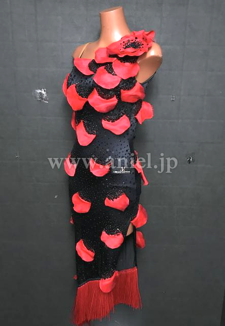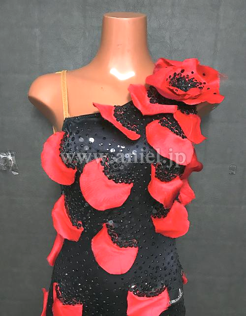 黒のボディに赤の花びらが立体的に散らされています。全体的に黒のストーンとスパンコールが散りばめられていて光が当たると光ります。