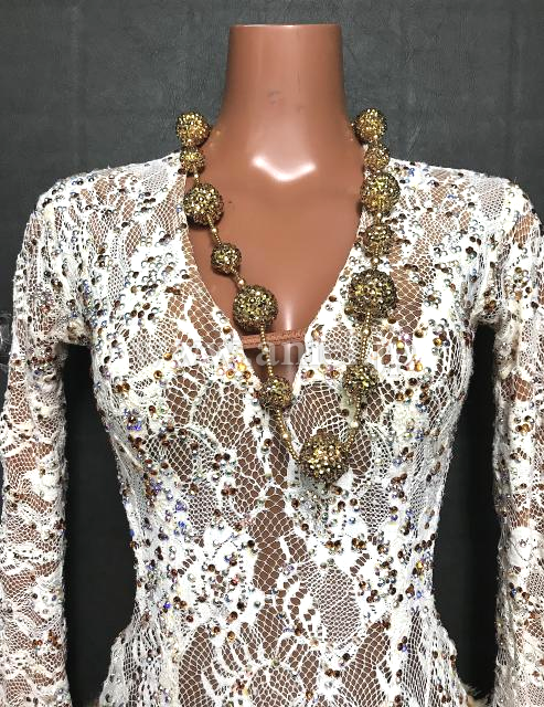 白のレース生地のボディに羽根がスカートに使われた上品なドレスです。