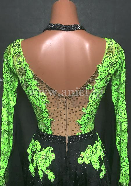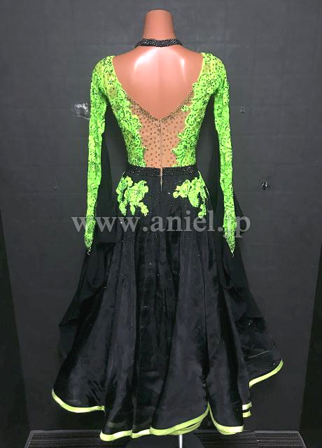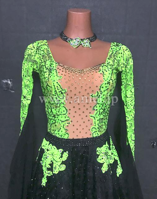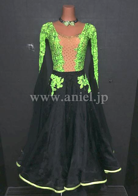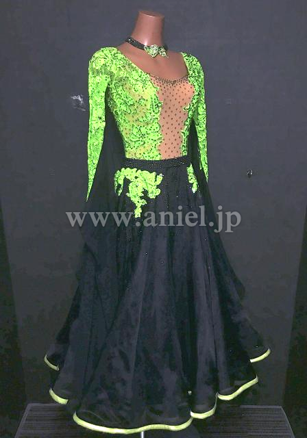 黄緑レースのボディに黒のスカートが広がります。