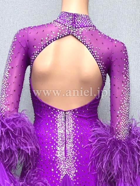 ハイネックボディ部分、背中を抜いたバックもラインストーンをふんだんに配しています