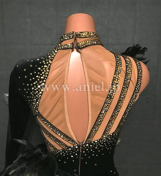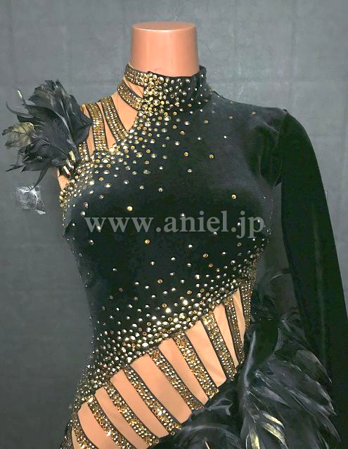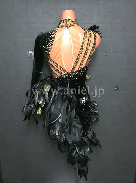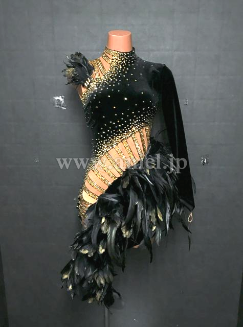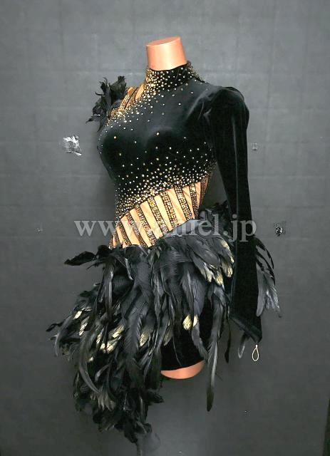 黒のベルベット生地に立体フリル・羽根がインパクトのあるドレスです。