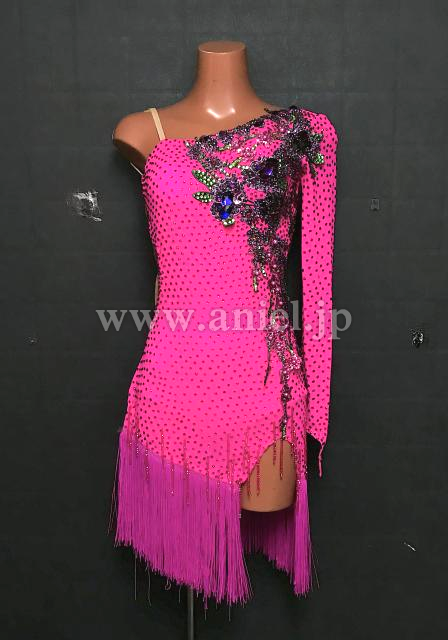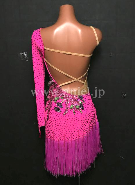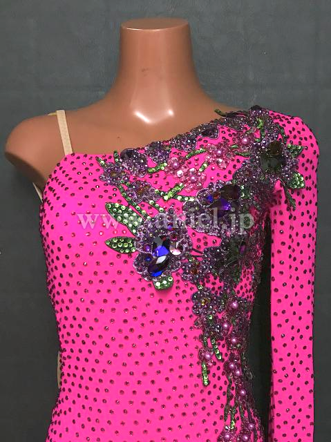 鮮やかなピンクにモチーフレースが華やかに映えるドレスです。