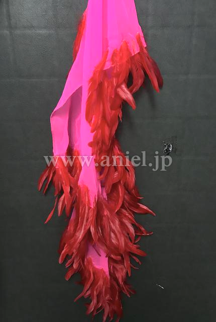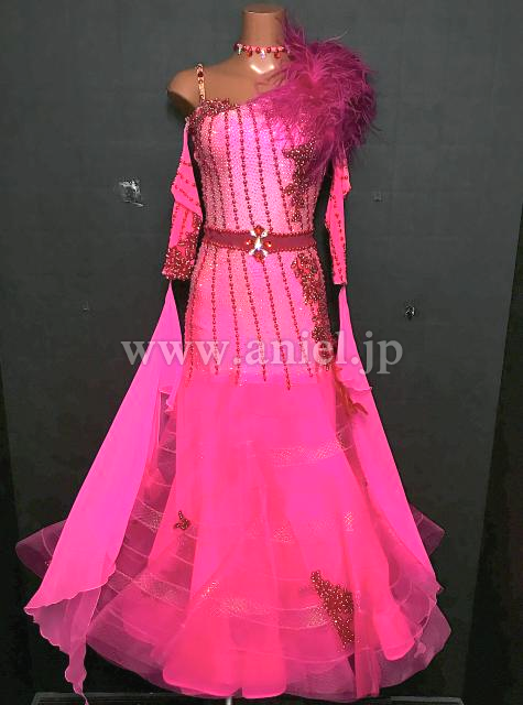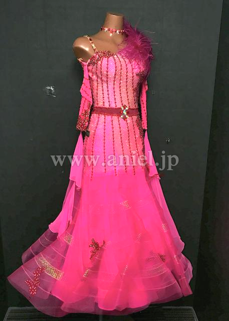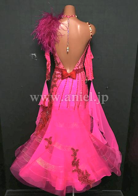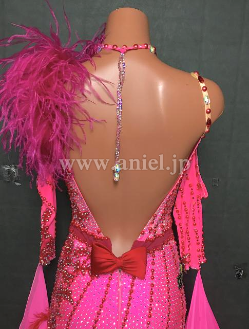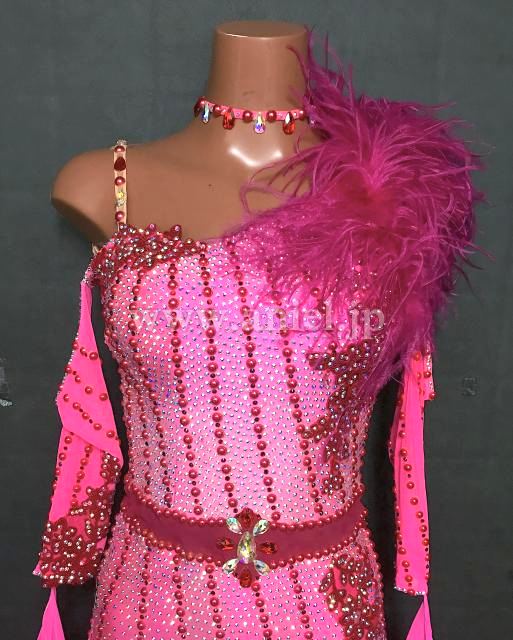 鮮やかなショッキングピンクに赤のパールが華やかなドレスです。