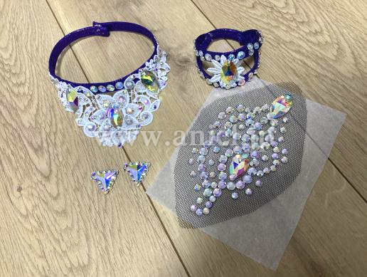 ボディ&背中をほどよくドレープがカバーしながら、生地と白モチーフとオーロラストーンが輝きます。