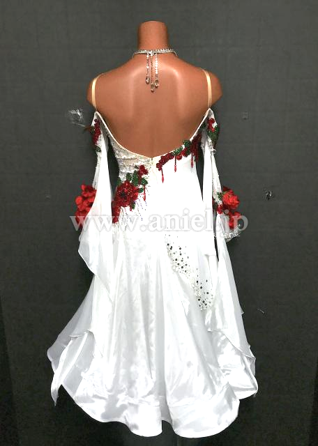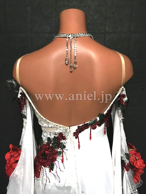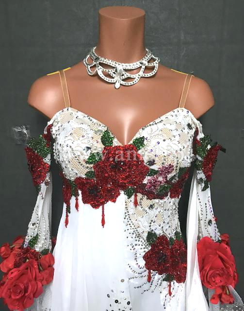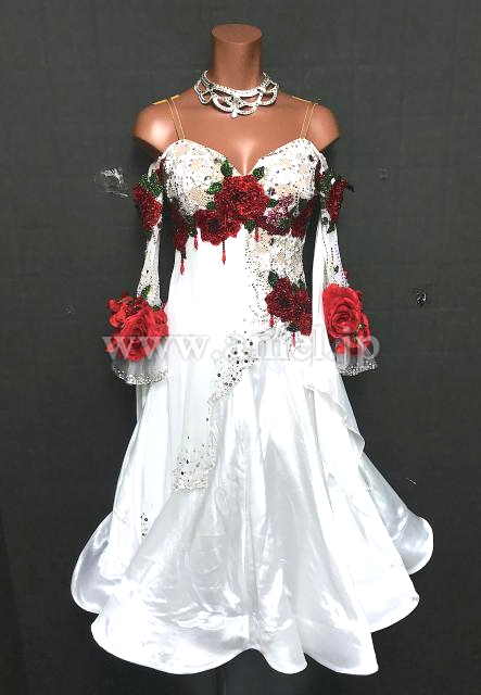 純白のドレスに赤の薔薇モチーフが映えるドレスです。