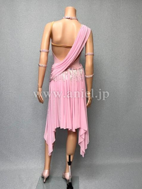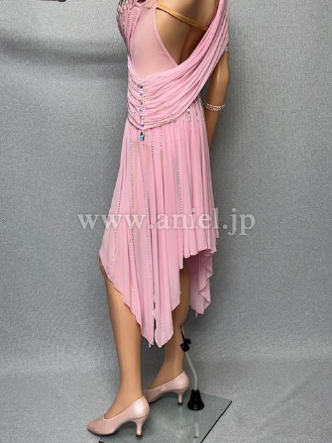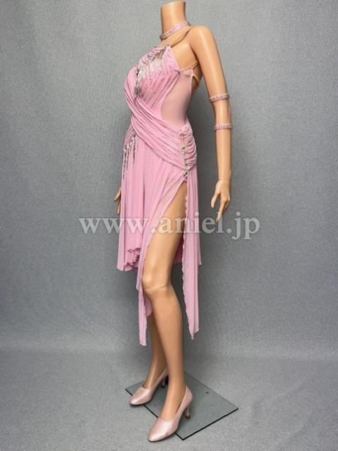 ストレッチメッシュのドレープをデザインに生かして柔らかい感じのドレスに仕立てています。