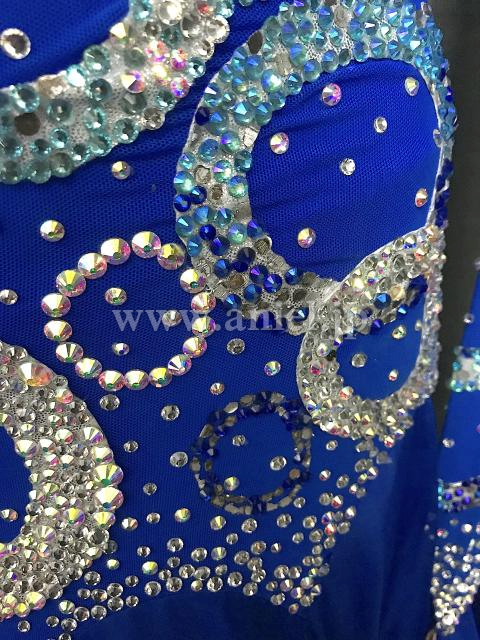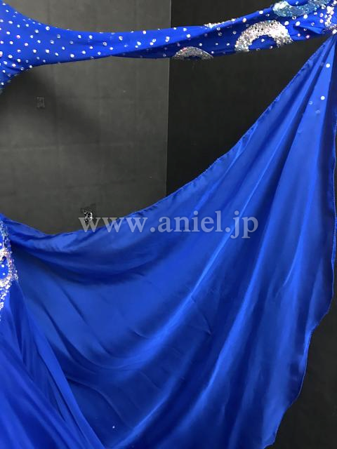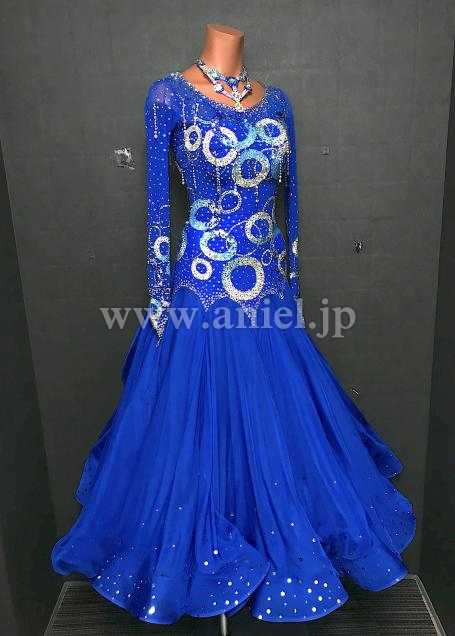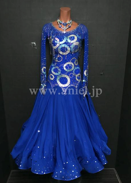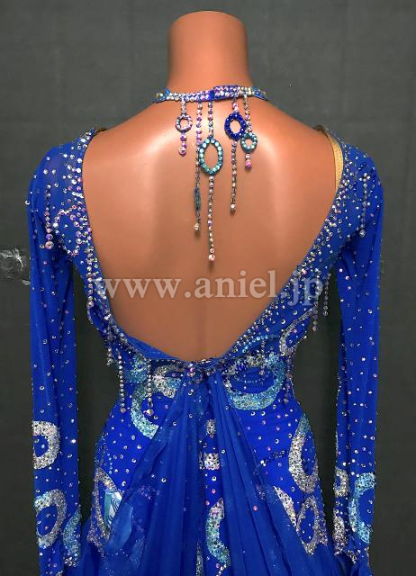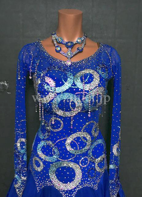 青にストーンで描かれた円モチーフがキラキラ光るドレスです。