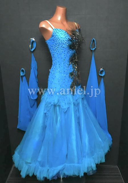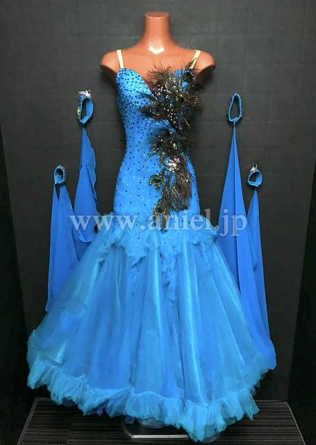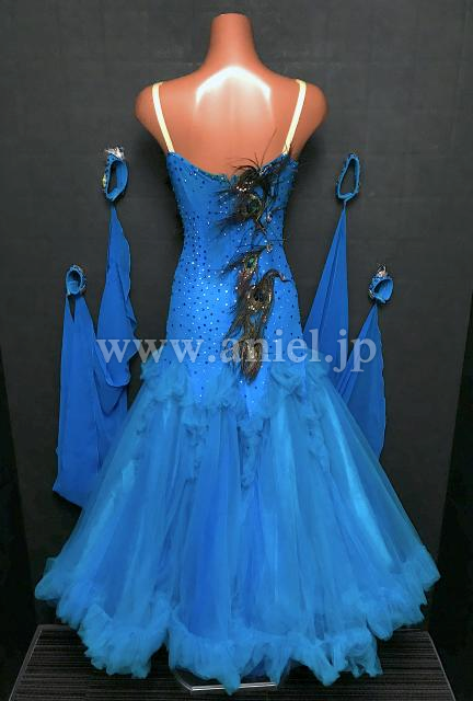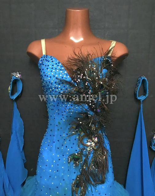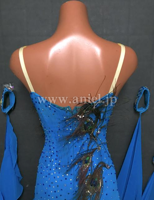 鮮やかな青に孔雀羽根の装飾が個性的なドレスです。