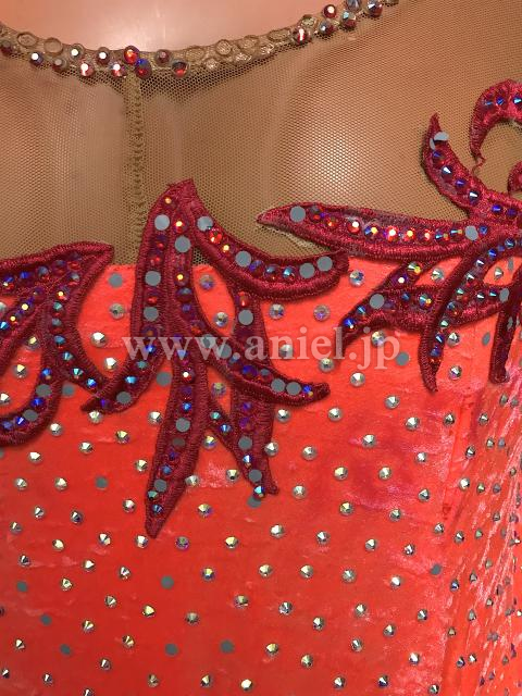 オレンジベルベットにモチーフレースのラインが美しいドレスです。